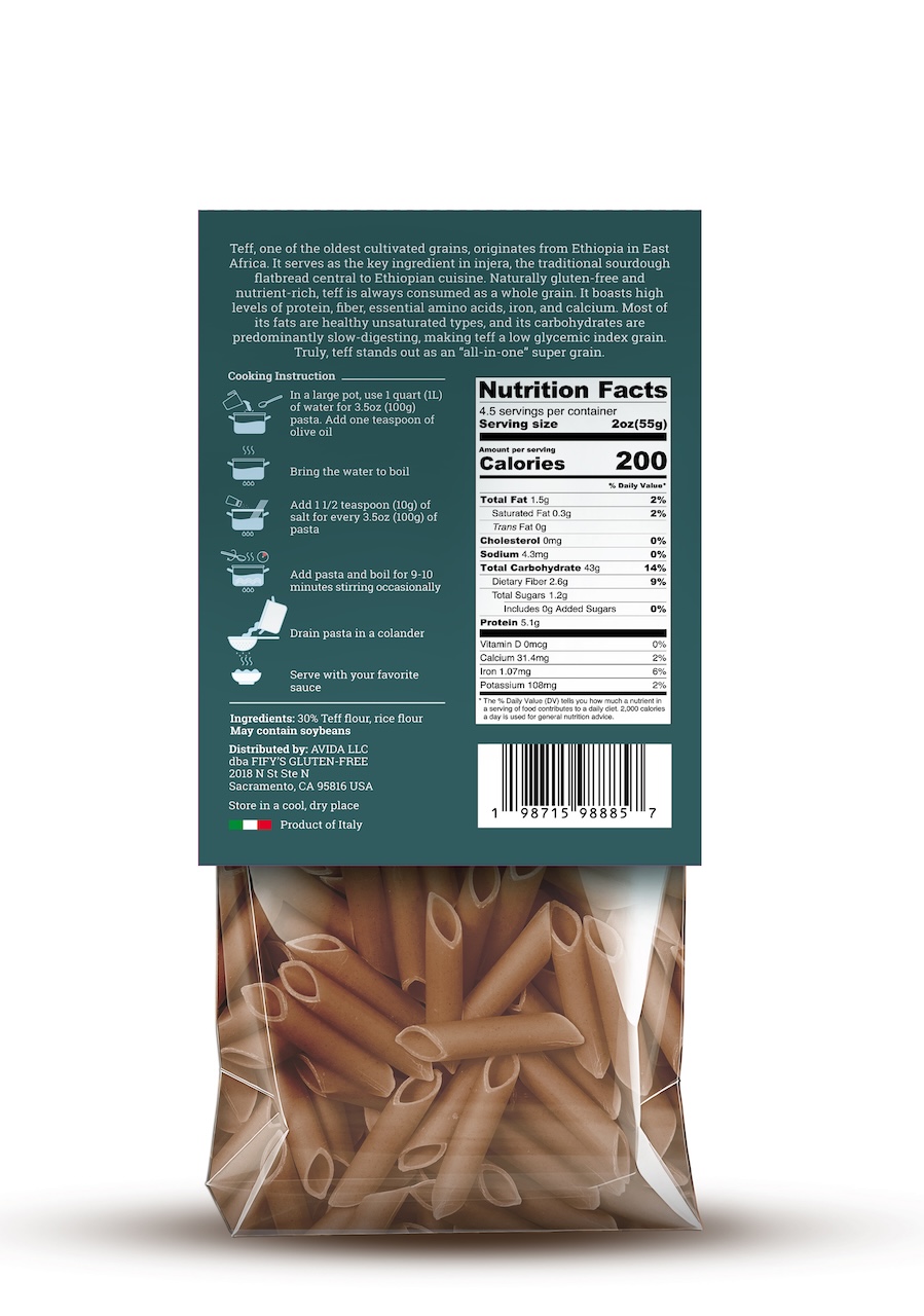 The star ingredient, teff, is an ancient grain packed with protein, fiber, iron, calcium, and essential amino acids. Naturally gluten-free and low on the glycemic index, teff provides lasting energy and easy digestion — making our penne a smart and satisfying choice for every kind of eater.