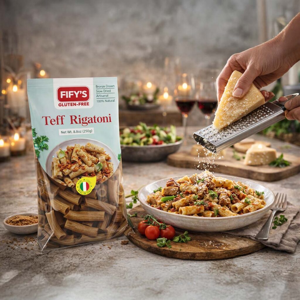 Naturally gluten-free and rich in protein, fiber, iron, and calcium, this robust pasta is perfect for rich ragù, baked dishes, and comforting family meals. FIFY’s Teff Rigatoni delivers authentic taste, satisfying bite, and wholesome nourishment — without compromise.